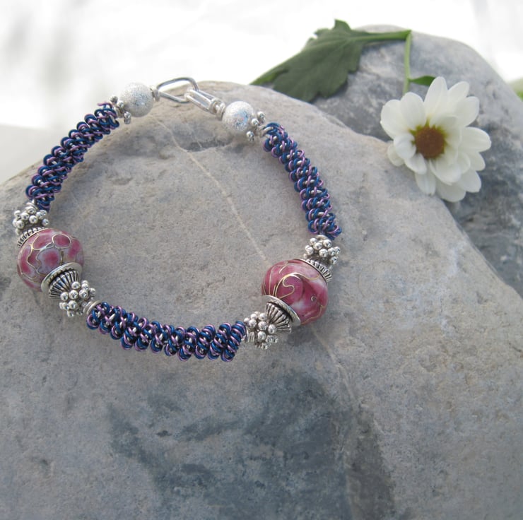 Accented with Silver plated spacer and Stardust beads and completed with Rose Cloisonne glass beads.