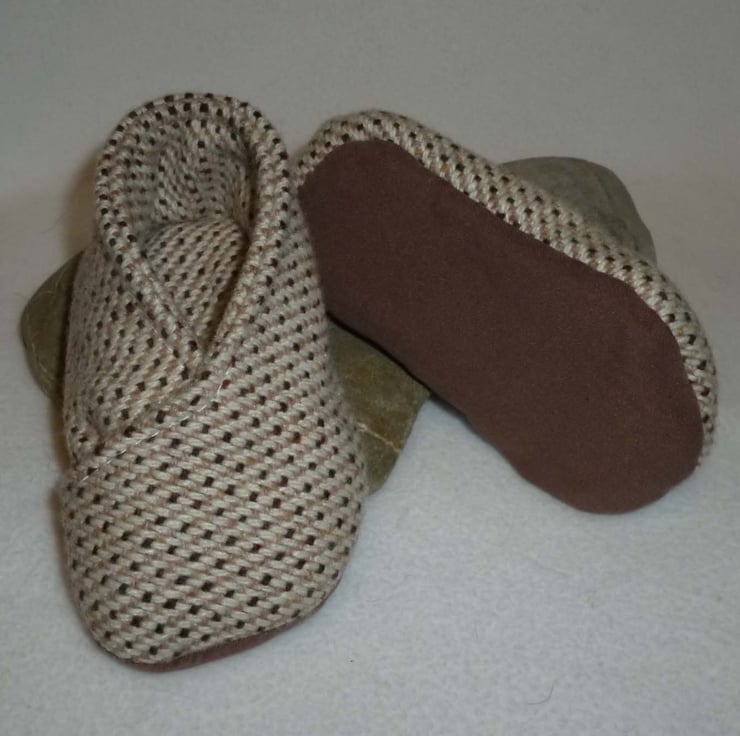 These hand sewn shoes are made from a wool blend tweed style of fabric. Stitched with a same fabric lining, but with a microfibre sole, for wear. (incase you have a tiny one intent on standing!)