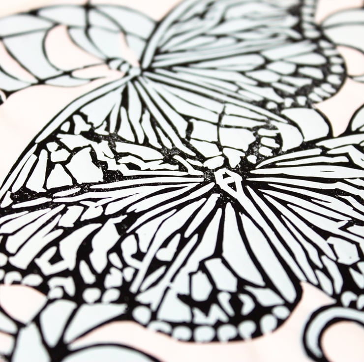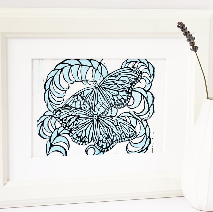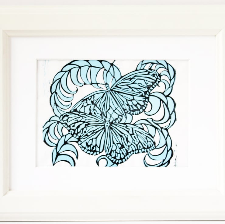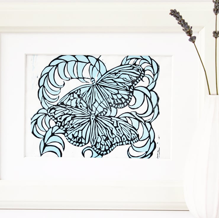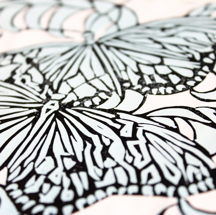 This image developed from an original drawing in my sketchbook, where I studied the intricate pattern detailing of the butterfly and created stylised fern forms.
