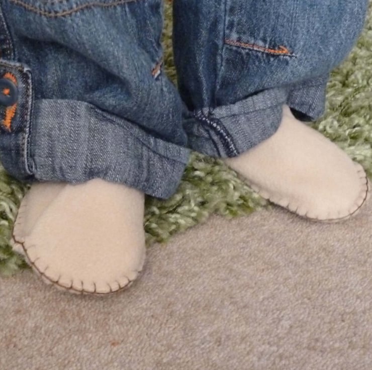 I wanted to adapt the pattern I had for preemie & newborn babies onto something a little bigger for those with bigger babies, or older ones. These are great little shoes light weight but warm, and quick to wash & dry as they're a single layer fleece.
