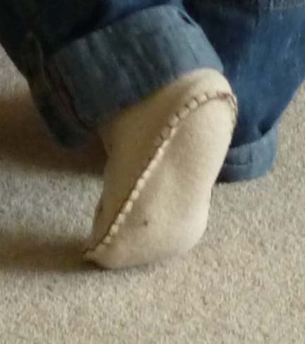 With a small decorative cross stitch holding a strip of elastic within the shoe upper to help keep those wriggling feet inside.