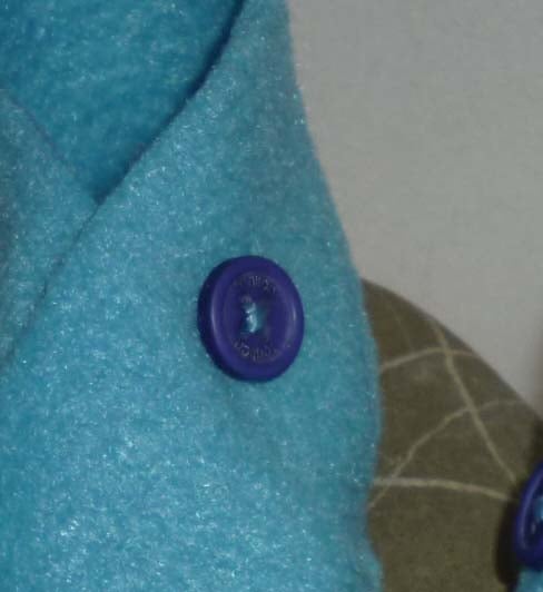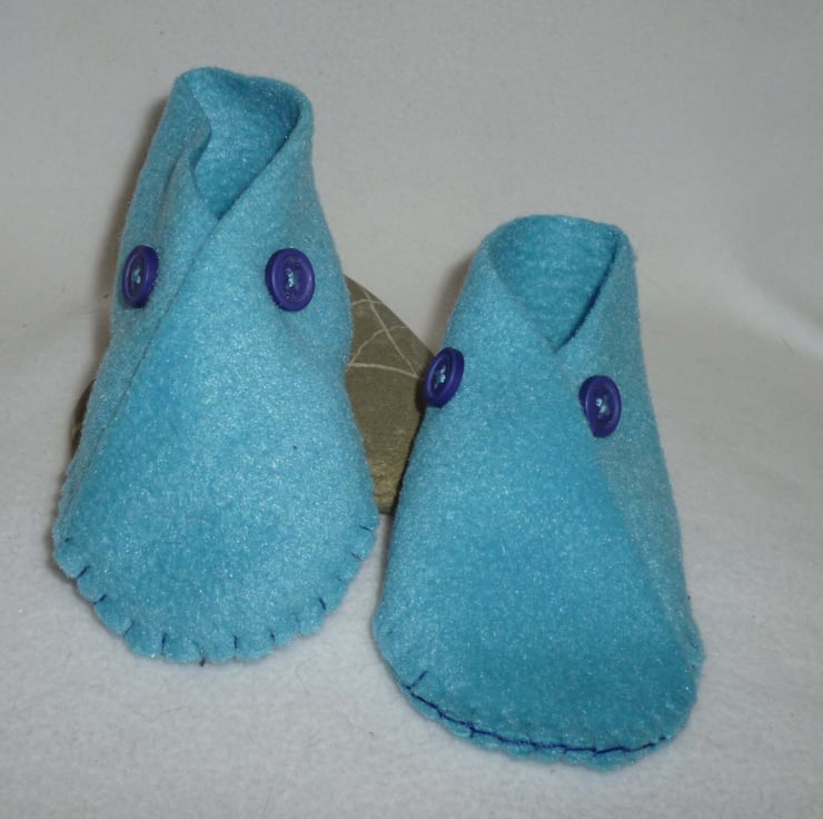 Hand stitched baby shoes, in a soft pale blue/turquoise fleece fabric with contrasting dark blue blanket stitch edging and co-ordinating buttons, purely for decoration.