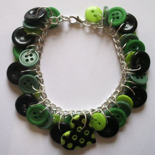This distinctive button bracelet rich with an assortment of green and black buttons, features a big green and black heart shaped button.