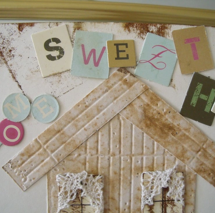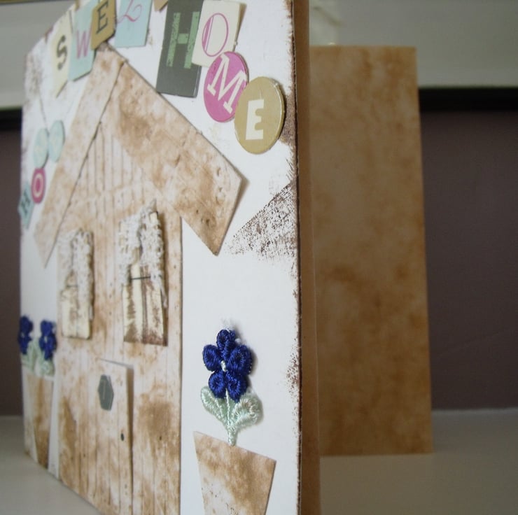 A shabby shed made from embossed coffee card. Cotton lace curtains and No 7 on the door which opens. Two plant pots with fabric flowers. Home Sweet Home added with cut out card letters.