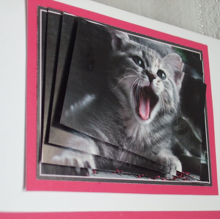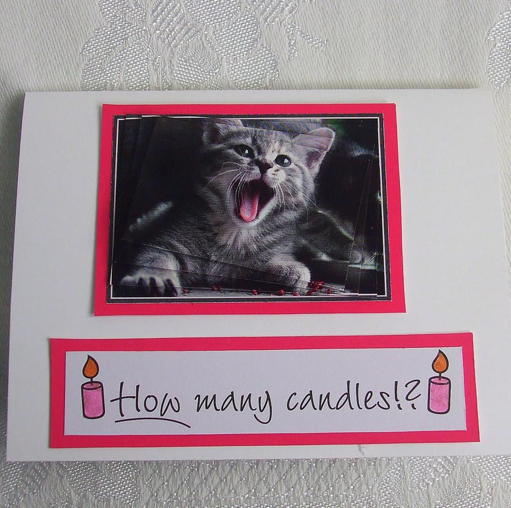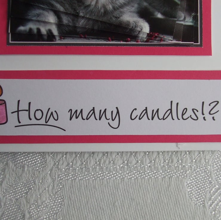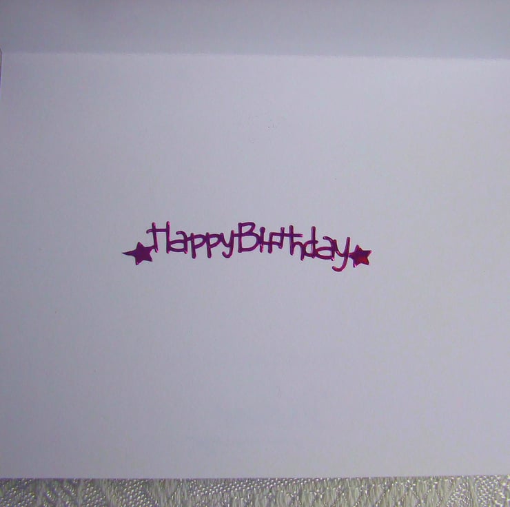 The topper has been mounted onto bright pink card before being stacked in 4 layers, each layer is twisted slightly which gives a spiral effect to the image. The greeting has been mounted onto the same pink card & the 2 candles coloured with glitter pens to match.