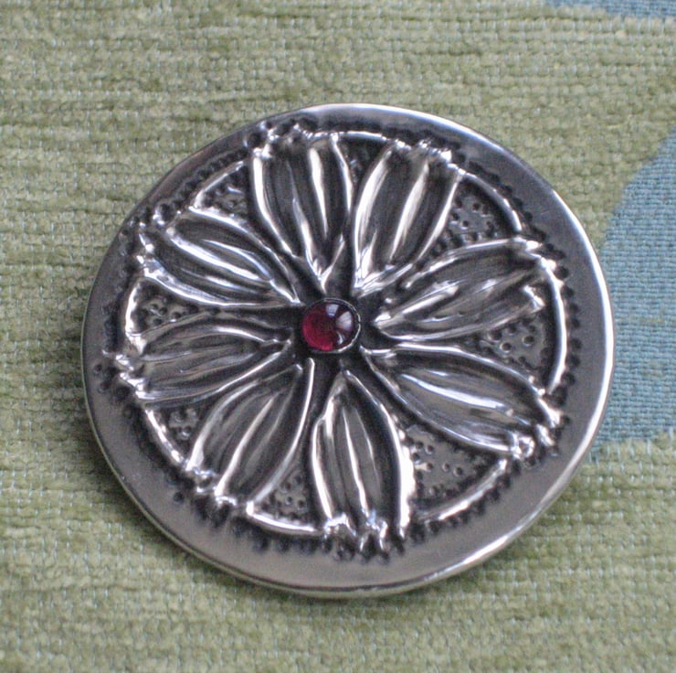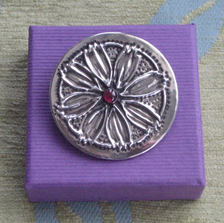 This lovely brooch features a beautiful genuine garnet cabochon. Measuring 45mm in diameter, the brooch has been hand-made in shiny modern pewter.There is a 30mm