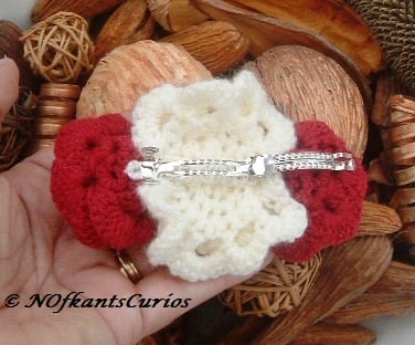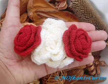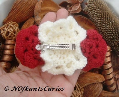 War of the Roses Hair Accessory is a wonderful hand crocheted, very textural and 3D hair clip, fashioned in the form of romantic red and cream coloured roses in full bloom, linked together in a linear design, with the larger cream rose in the centre.