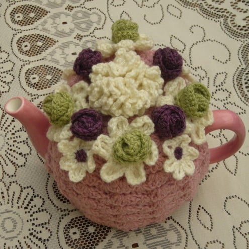 The cosy has been handmade using good quality wool-mix yarn in a lovely dusty pink colour. The top of the cosy is decorated with a large cream carnation, four small magenta roses, four cream flowers with petals and sage green rose centres and six pretty little cream flowers with magenta crocheted bobble centres.