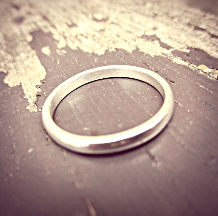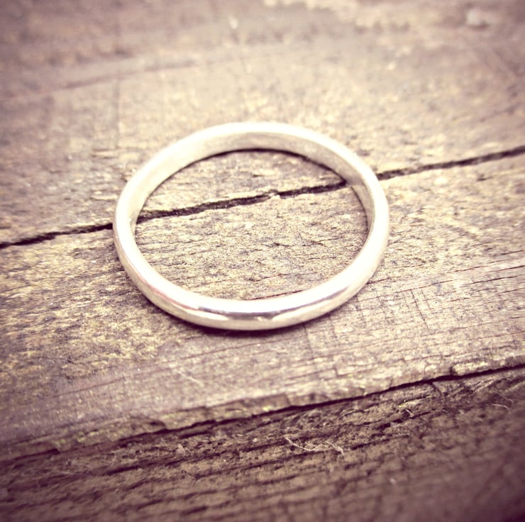 Just over 2mm wide. Suitable for stacking with others or beautiful on her own.