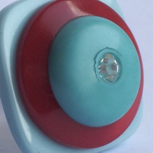 This distinctive button ring features a deep red, pale and dark turquoise button with a diamante centre .