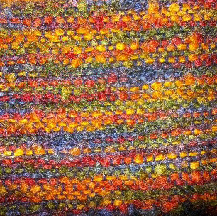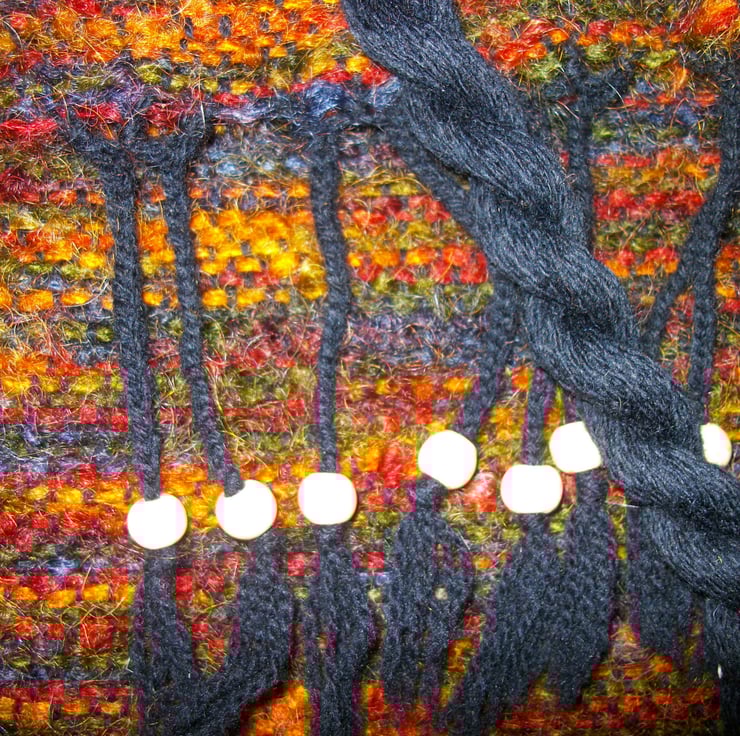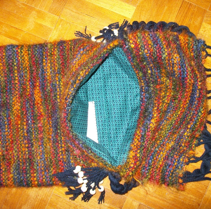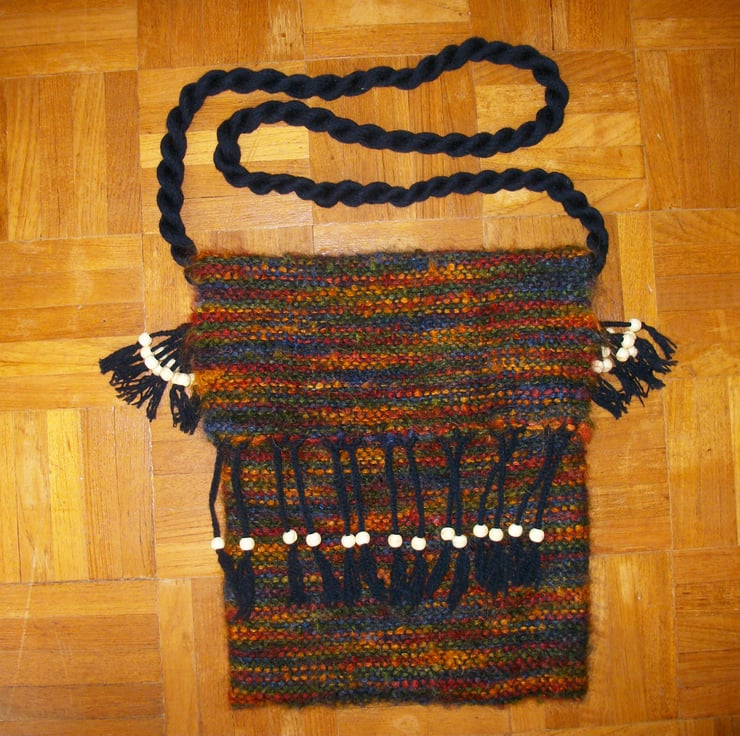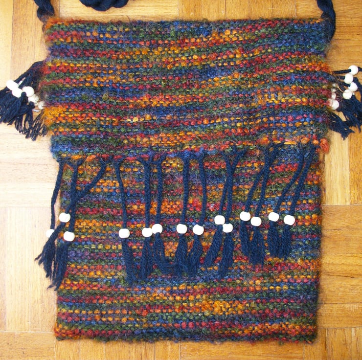 The woven fabric is constructed from a warp of 4 ply 100% wool in black, and the weft is a 78% mohair, 13% wool and 9% nylon blend in multicolours. This has been stitched into a bag measuring 10" wide and 12" deep with a flap of 5". The flap is finished with plaited and beaded tassels of 4.5", giving a total flap size of 9.5".