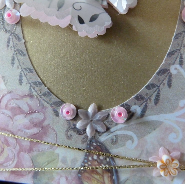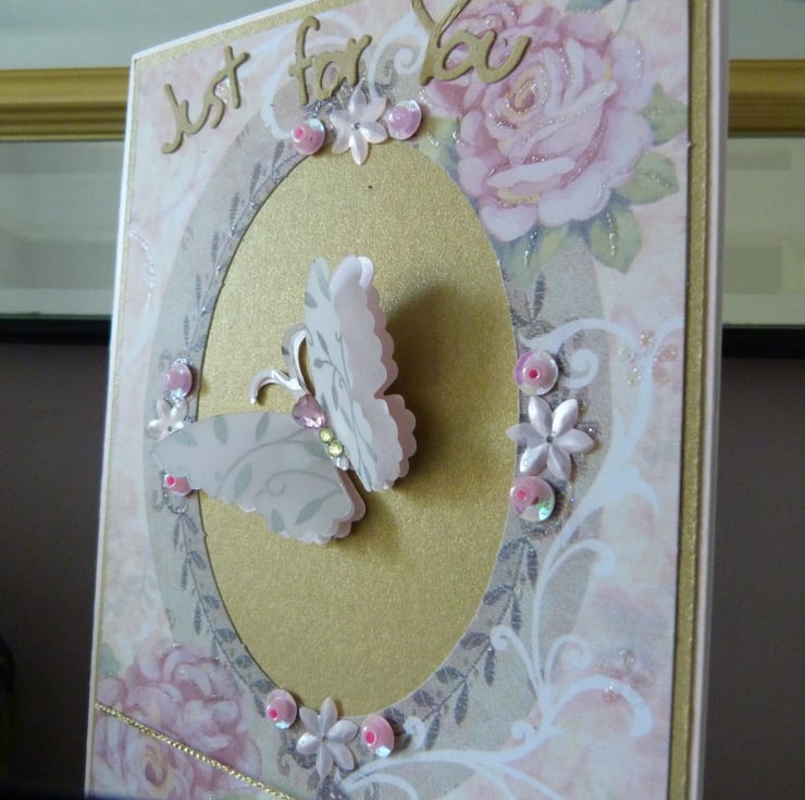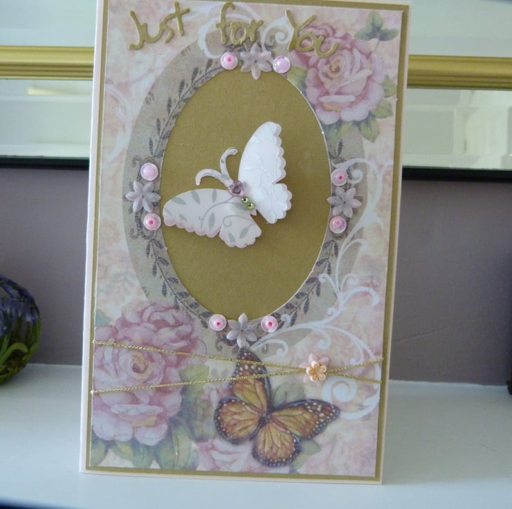 A beautiful vintage card which has had oval insert cut out. Matted onto gold card and then onto pale pink pearl card. Two strands of gold threaded through orange flower bead. A pretty three layered butterfly, top layer of silvered vellum, filling the aperture. Further embellished with pink beads and Just For You die cut from gold card. Butterfly body embellished with pink and yellow crystals.