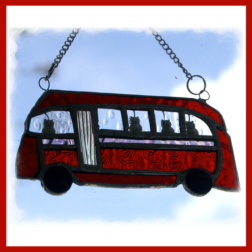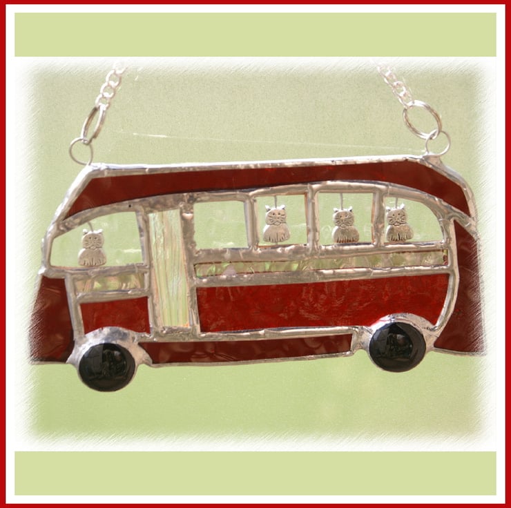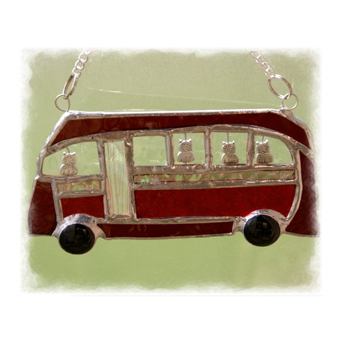 The suncatcher hangs from a little chain which is securely attached to the top of the bus at either side.
