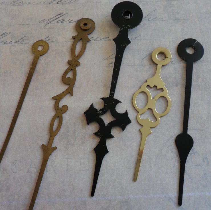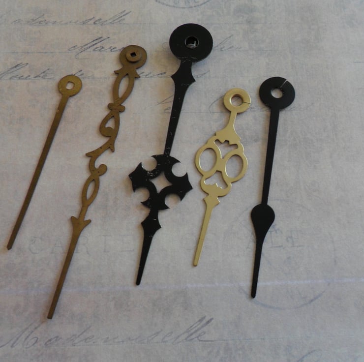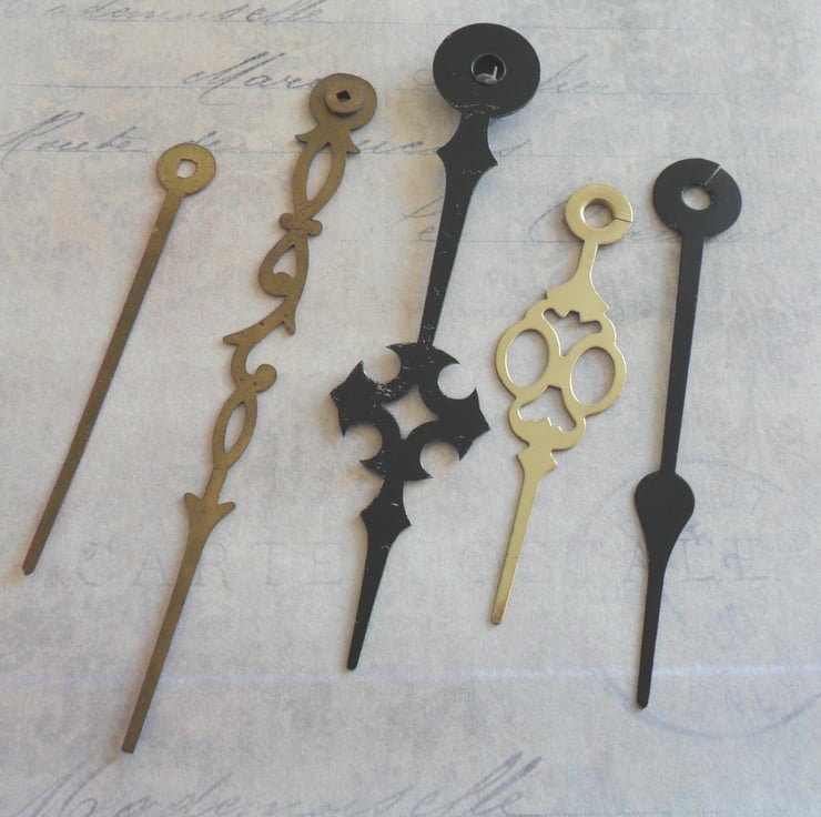 5 ornate hands from vintage clock movements. Gold, silver and Black with lovely designs and details.