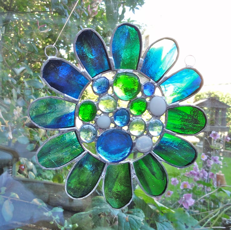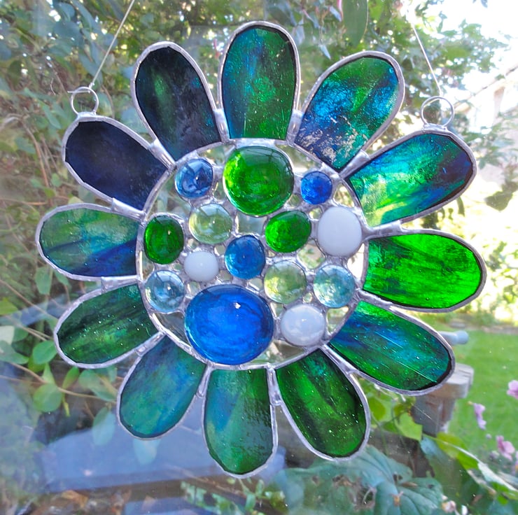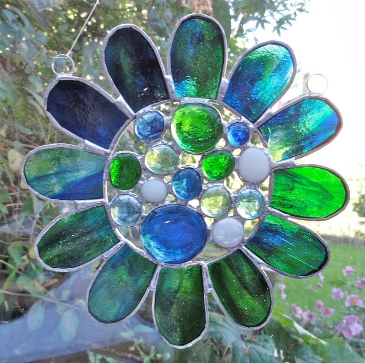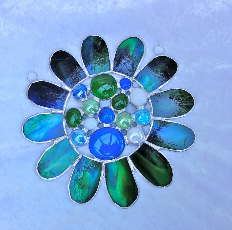 Each of the 12 daisy petals measure 3 cms by 4 cms and there are 14 globs in the centre. The overall size of the suncatcher is 17.5 cms in diameter. Each piece has been copper foiled, soldered and left with a silver finish. Two rings and a short length of fishing line have been attached for hanging purposes.