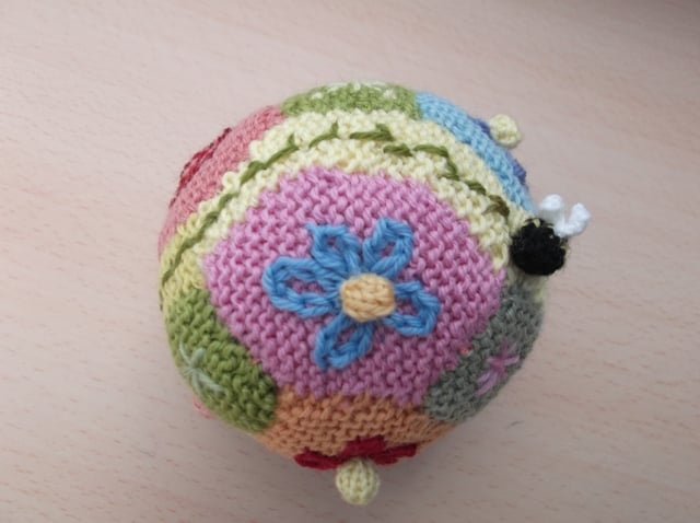 Hand knitted ball. The yarns used are very good quality 100% wool. Clean and safe synthetic filling inside. 35cm around, good size for small hands. Flowers and stars embroideries in some squares, and a bee is attached. Safe for small children but please take care not to pull the middle of the flowers and the bee too hard.