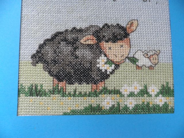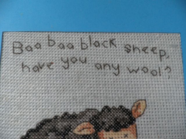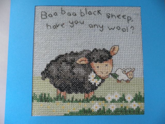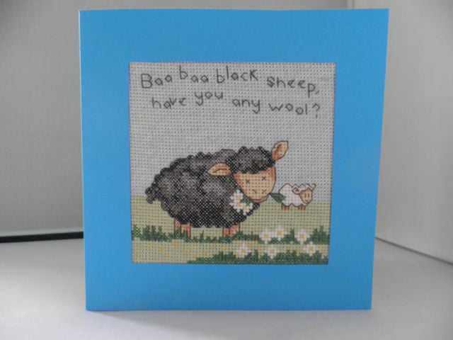 Cross stitch card with the words Baa baa black sheep have you any wool?' in a blue aperture card, there is wadding behind the stitching to add a lovely padded effect. The card has been left blank for you to leave your own message. The card measures 14.5 cm square and comes with a white envelope and in a clear cellophane bag for protection. As well as a card it would also make a lovely picture for a nursery or child's room.