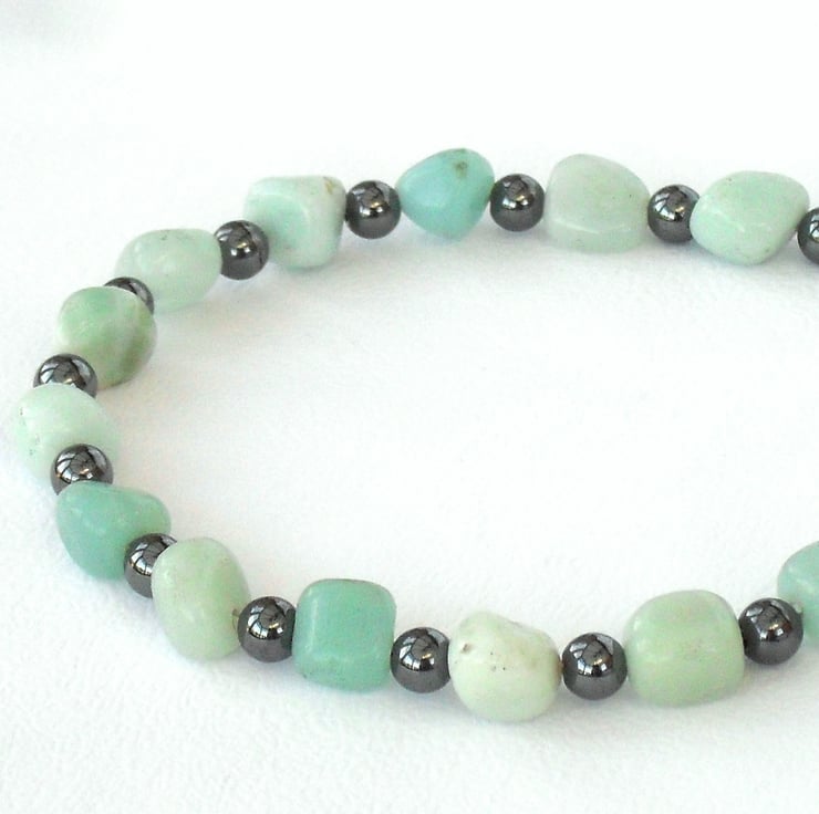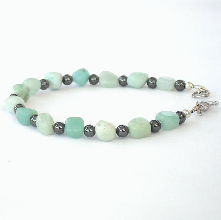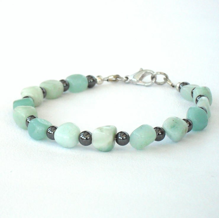 I have made this dainty bracelet using pretty blue / green amazonite nuggets, interspersed with hematite beads. The individual nuggets show the natural variations in the shades and depth of colour of this lovely gemstone, and make it unique.