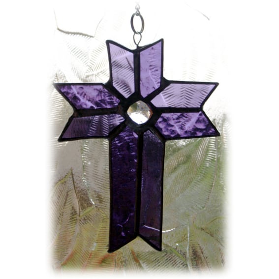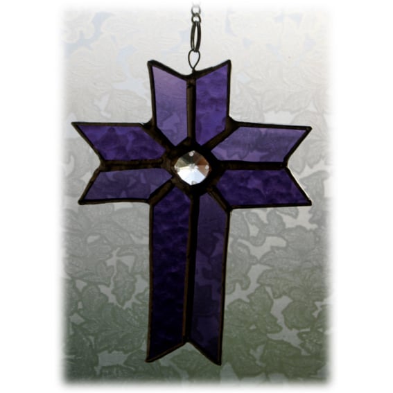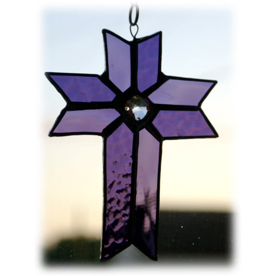 It is a cross made from 2 tones and texture of beautiful purple glass to give it a slight 3-dimensional effect.. One is a purple 'muffle' glass with a light bubbly texture, the other a beautiful waterglass with a gentle ripple.