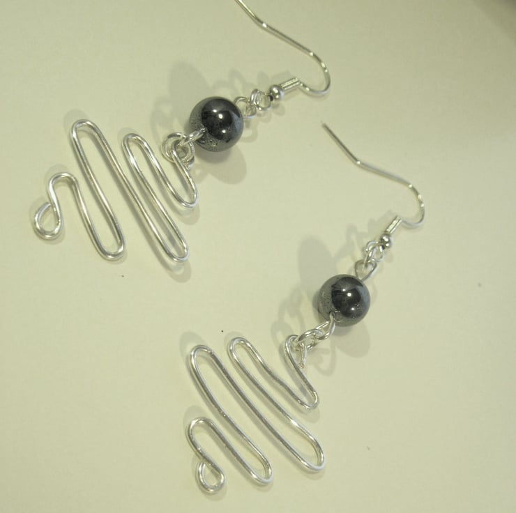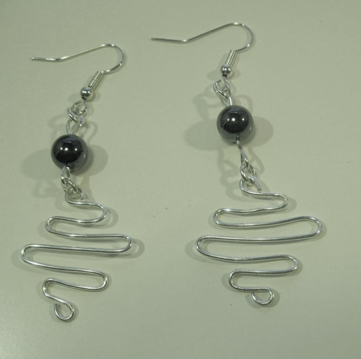Silver Plated hand formed earrings incorporating Hematite bead.