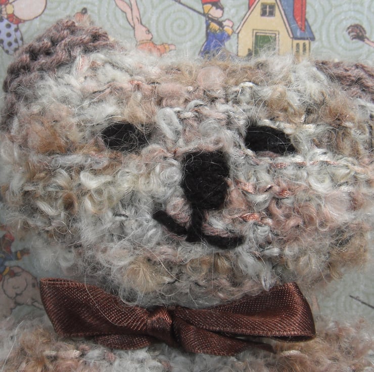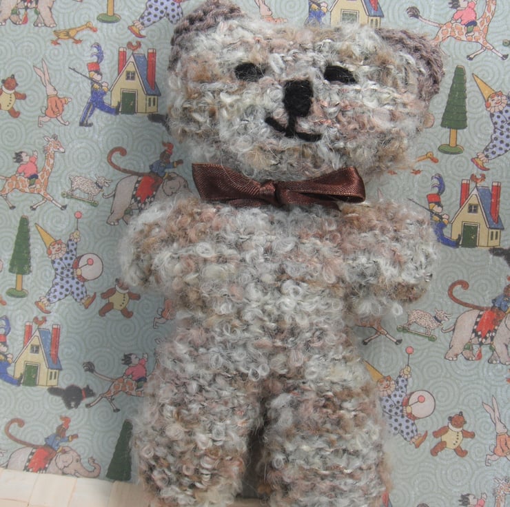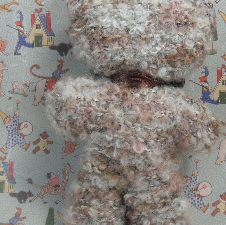 I am Hand knitted in multi brown wool. My face is hand stitched and i have a brown ribbon bow and Stuffed with supersoft polyester toy filling.