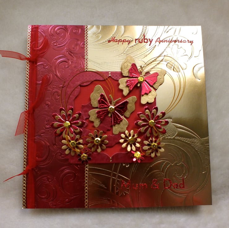 A luxury handmade Ruby Wedding Anniversary card for a special Mum and Dad, this exquisite card is large at 8"x8" square. It is adorned with embellishments: attractive wire flourishes with flowers and butterflies, on red and gold embossed, metallic card, plus organza ribbon. Includes 'Many Congratulations on your Ruby Wedding Anniversary' sentiment inside.