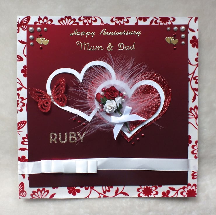A luxury handmade Ruby Wedding Anniversary card for a special Mum and Dad, this exquisite card is large at 8"x8" square. The main centre piece is two entwined loving hearts, embellished with roses and red glitter butterfly, on deep red satin card, backed onto red flock and lustre pearl, Cristina Re 'Papillon Rouge' designer paper. Includes 'Many Congratulations on your Ruby Wedding Anniversary' sentiment inside.