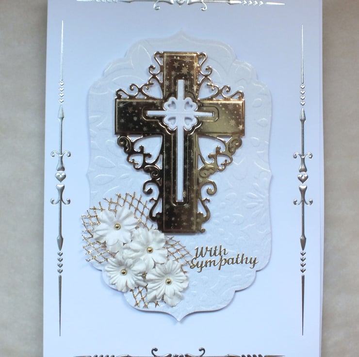 Luxury handmade, size A5, Sympathy card, embellished with an ornate gold cross with flowers, on high quality silver foiled white card, and 'thinking of you' sentiment inside.