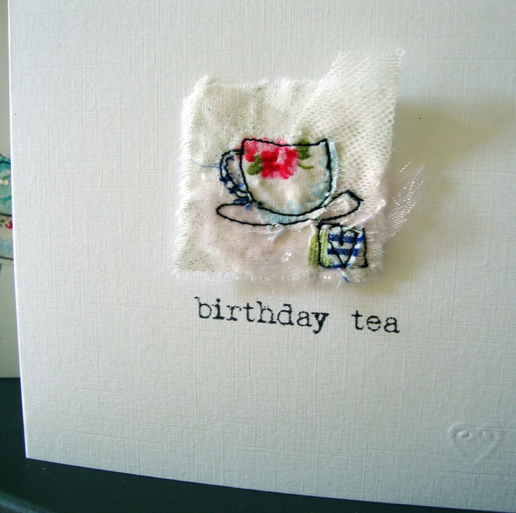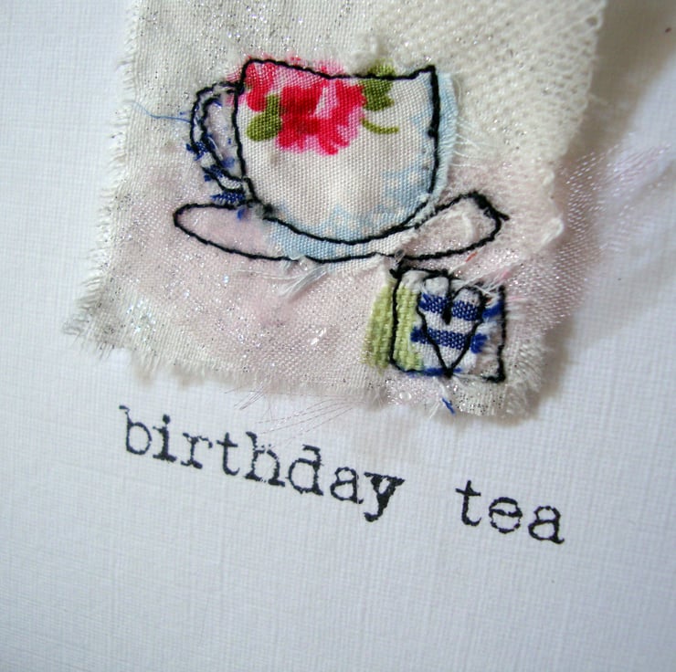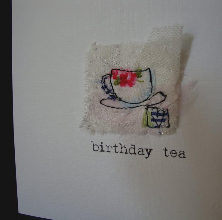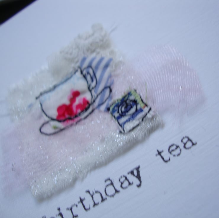 a lovely handmade card with a floral fabric tea cup free machined and embellished with lace and sparkle.