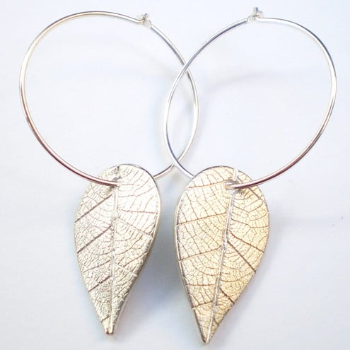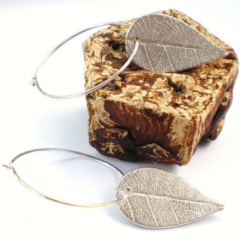 Brushed fine silver teardrop shaped earrings with a fine leaf texture, hung on hoop style sterling silver earring wires.
