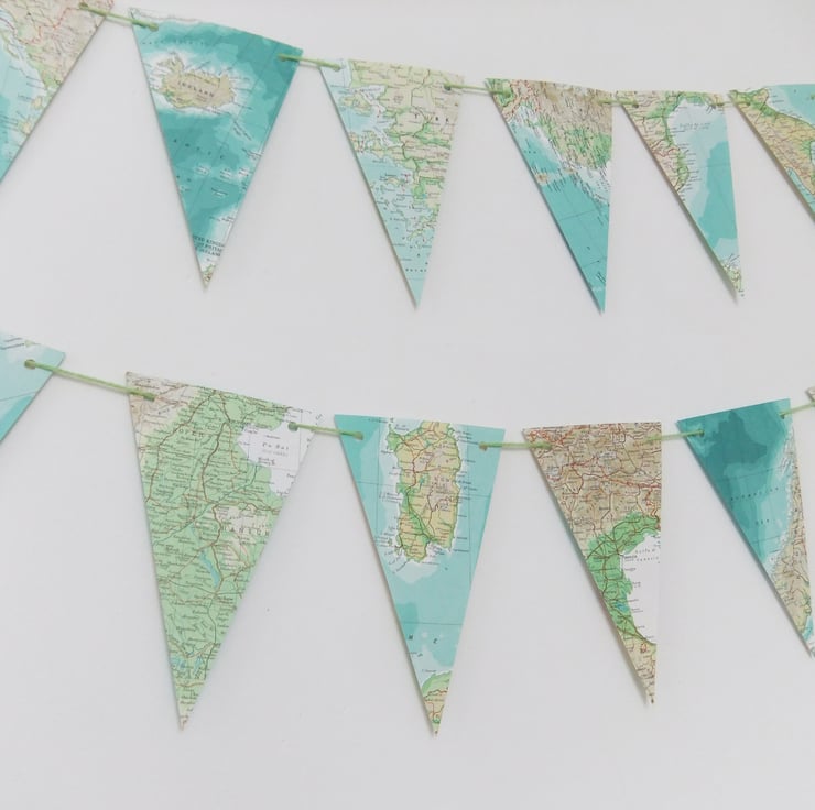 This eco-friendly garland was designed to be viewed from one side only but the backs of the flags also have beautiful maps so it would be possible to hang the garland in the middle of a room (although some of the maps on the reverse side may be upside down....).