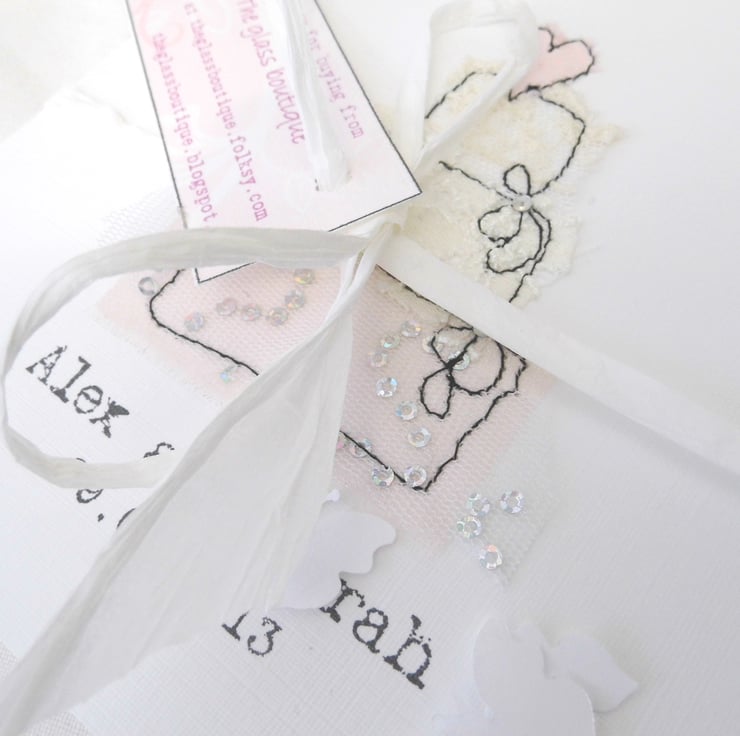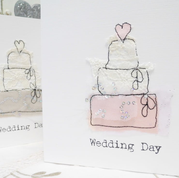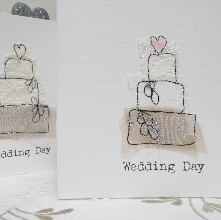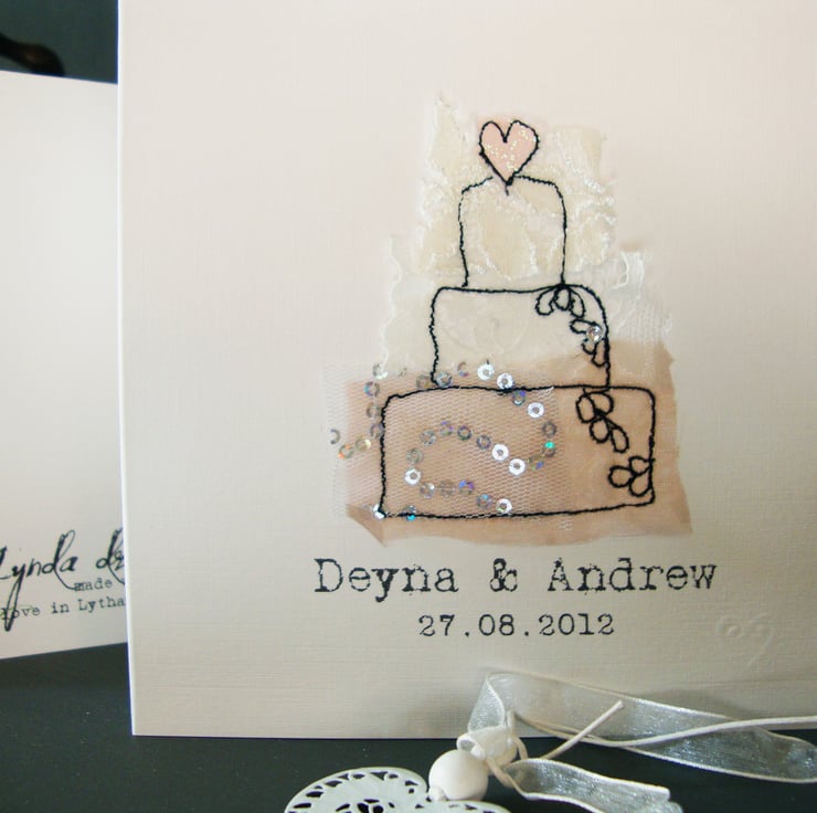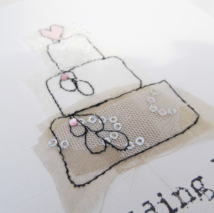 made from voile and lace and free machined onto white card with a touch of sparkle. It makes a lovely keepsake card for a special couple.