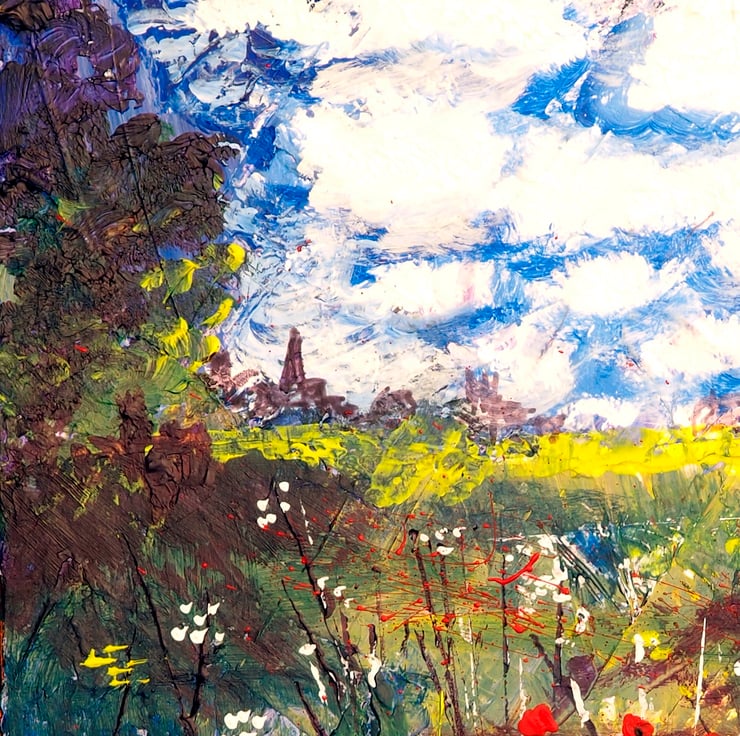 I painted this canvas using acrylic paints, with brushes and palette knives, building up the layers and scratching to describe the flower stems and grasses. The distant outline of buildings leads you in, I can imagine walking through the fields to see if there is a pub!