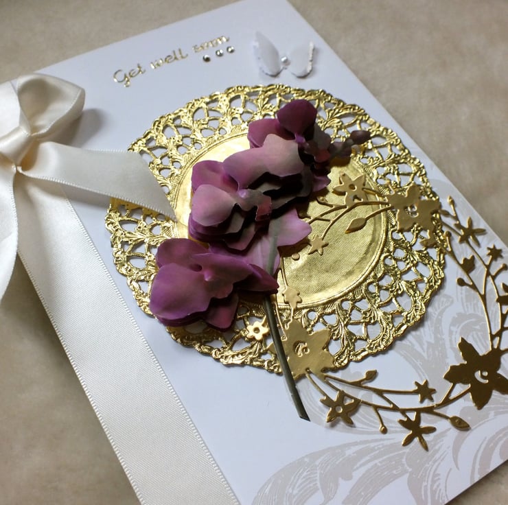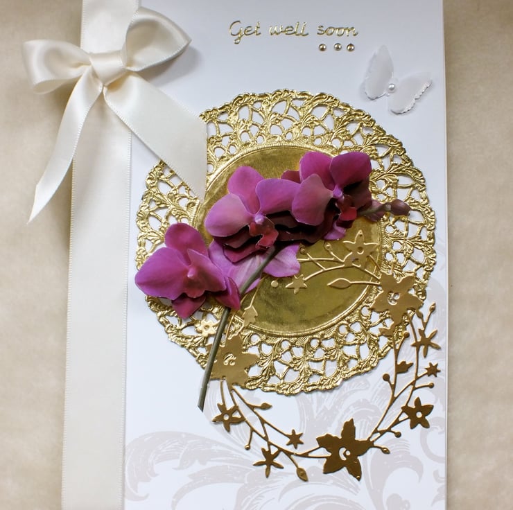 A luxury handmade 'Get Well Soon' card, size A5. This delightful card is embellished with a beautifully decoupaged orchid onto a gold doily, and elegant, gold flower frame, with cream satin bow, backed onto premium quality, swirl embossed card stock. Includes 'Get Well Soon' message inside.