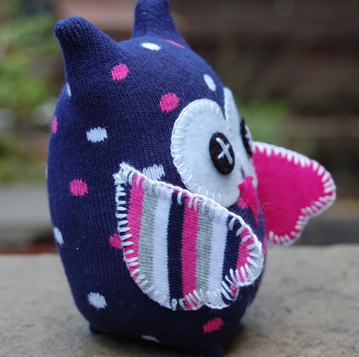 A fun soft toy made from brand new socks and filled with polyester fibrefill conforming to EN71, eyes and wings are made with felt