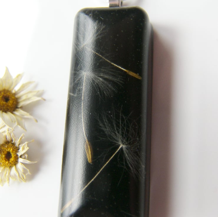 Description: I have very carefully added 3 real dandelion seeds to black UV resistant, non toxic resin. Took me days of layering the resin to achieve this result. Pendant measures approx 50mm x 15mm, (approx 2" x just over 0.5")) hangs on an 18" silver plated chain. ( I love to wish, do you? This pendant makes for a great gift:)