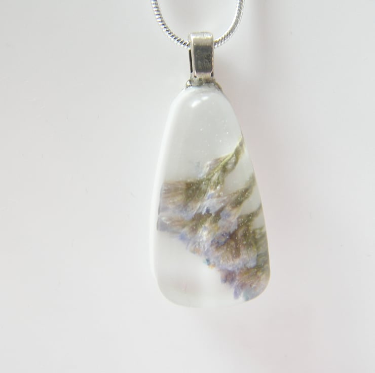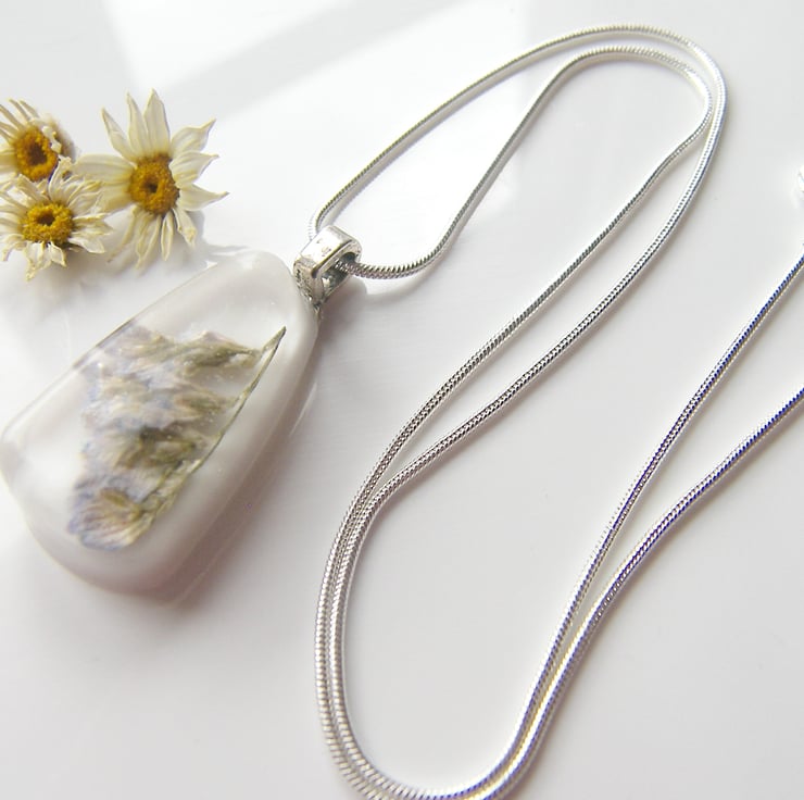 Description: I have very carefully treated this sea lavender to retain its lovely color before sealing in white non toxic uv resistant resin. Teardrop pendant measures approx 35mm x 15mm, (almost 1.5" x 0.5") hangs on an 18" silver plated chain. (so pretty and feminine against the white resin