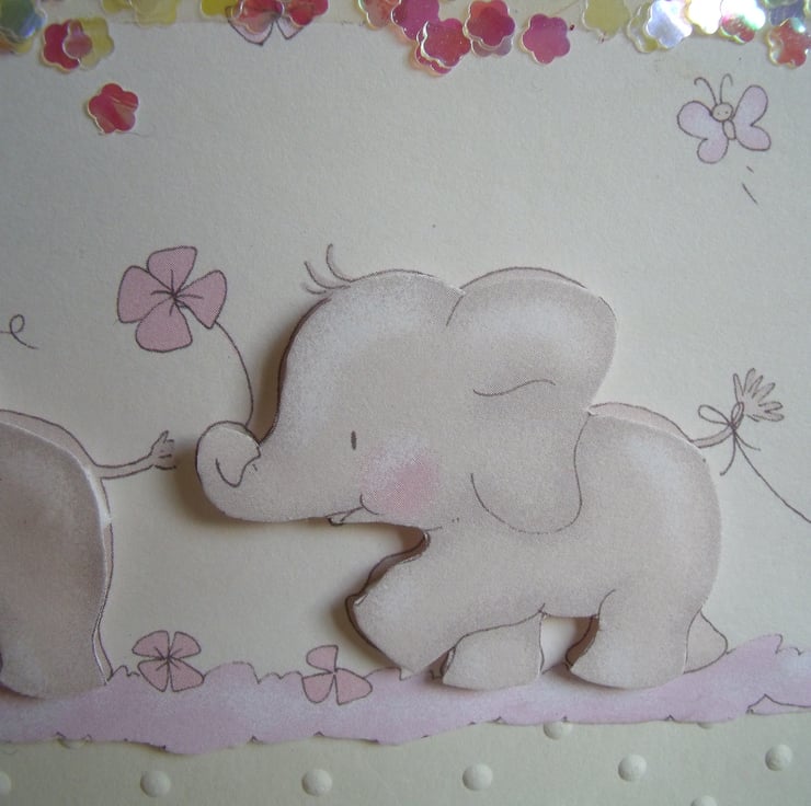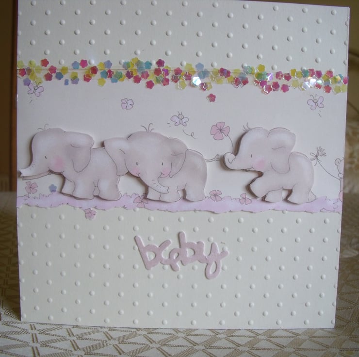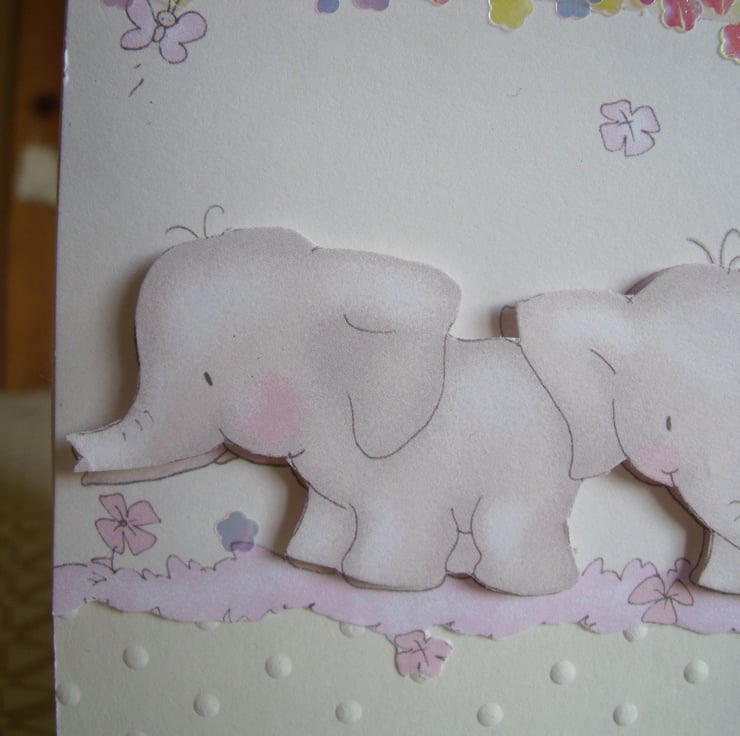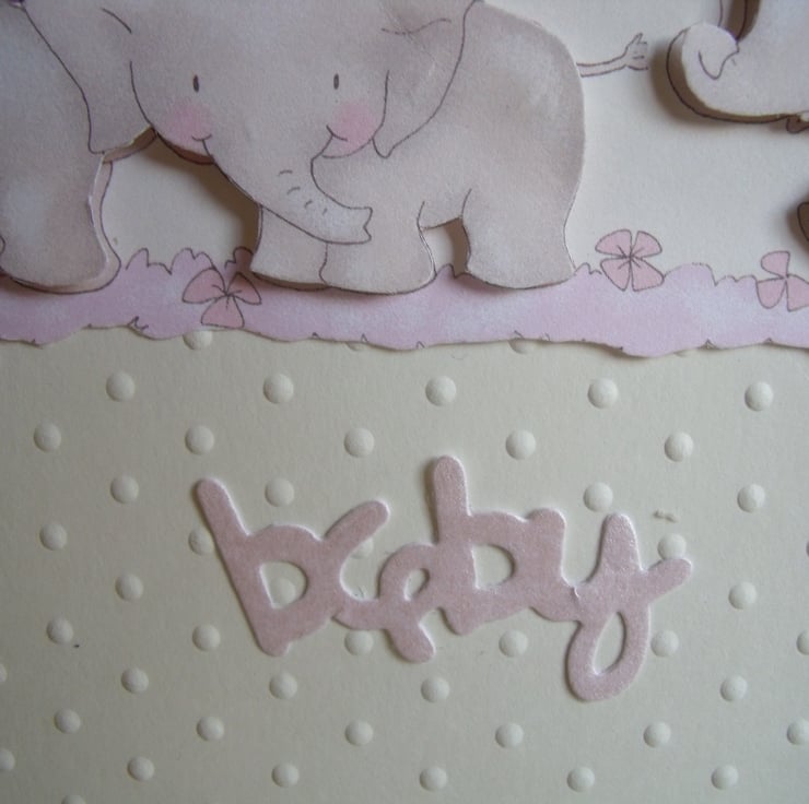 A row of so cute baby elephants decoupaged onto pretty paper. Mounted onto cream dot embossed quality card and then onto cream card. Embellished with tiny iridescent flowers and a die cut word baby from baby pink card.