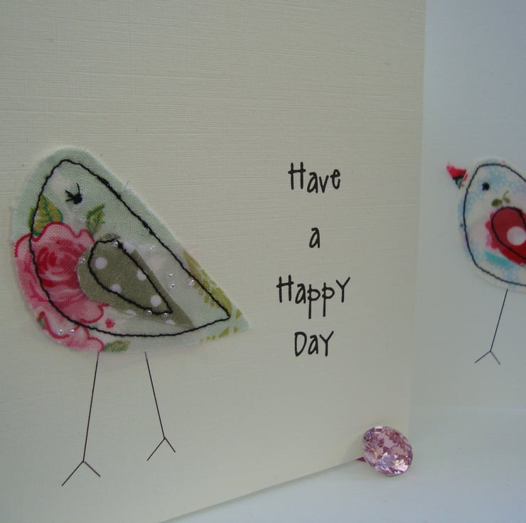 made from floral prints and spotsthis bird has been machine embroidered onto a white card with a matching envelope