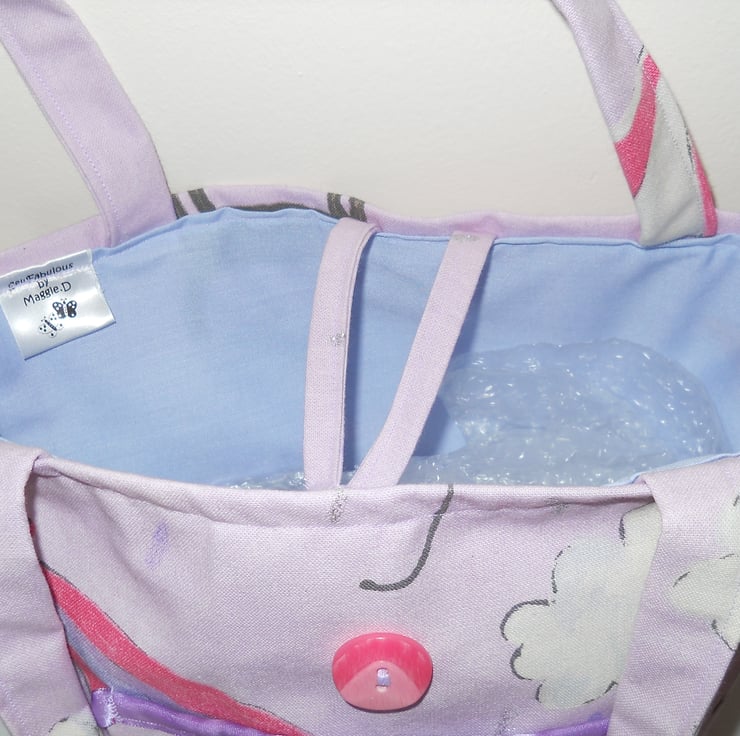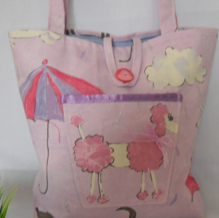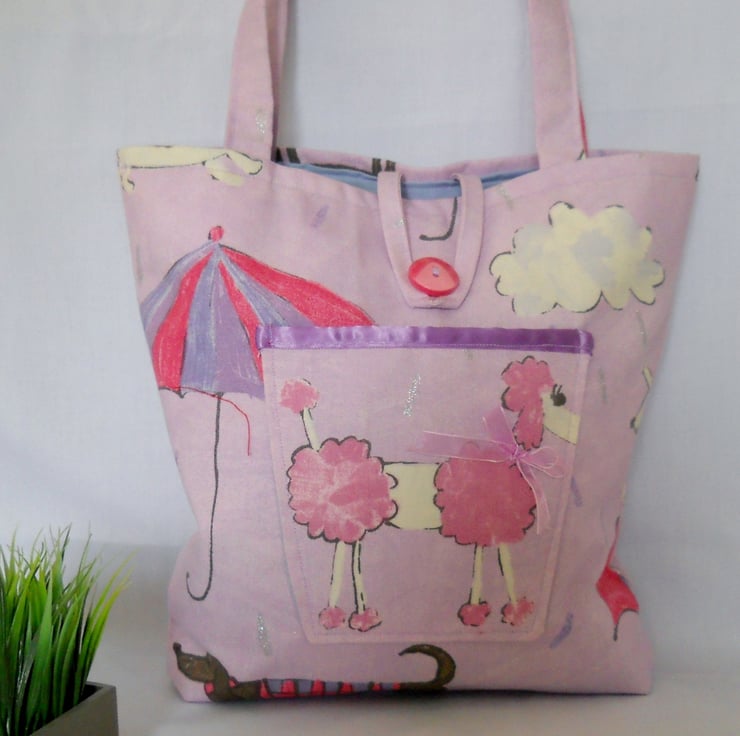 This is a fabulous bag and can be used for a number of uses, Shopping,Beach, knitting to name but a few. The fabric is HARLEQUIN ITS RAINING CATS AND DOGS. A good quality and weight fabric in a lovely lilac/pinky colour with darker pinks, blues and greys with splashes of sparkle every so often. The lining is blue cotton and the bag has a button closure at the front, also a handy feature pocket with a poodle sporting a pink bow. Ideal for mobile, purse, keys etc: