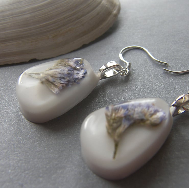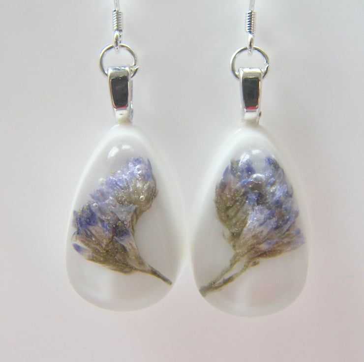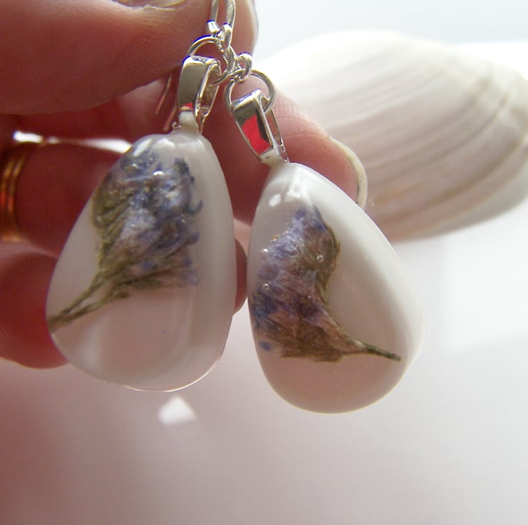 Description: I have very carefully added this pretty sea lavender and sealed in UV resistant, non toxic resin.. these teardrops measures approx 20mm x 12mm and hang from 925 sterling silver ear wires. So pretty and delicate in the white resin:)