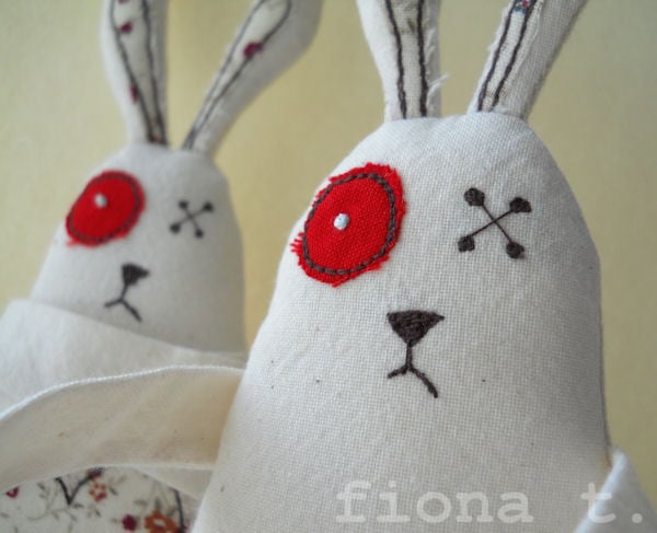 these rabbits have tiny pink rosebud-printed fabric on their ears, tummies and the cuffs of their straightjackets.