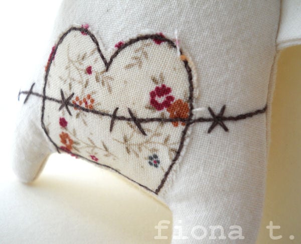 the printed cotton fabrics are appliqued onto pre-washed calico, and i then draw on the intricate details with free machine (free motion) embroidery, before making up the finished rabbit. their remaining eyeball is hand embroidered.