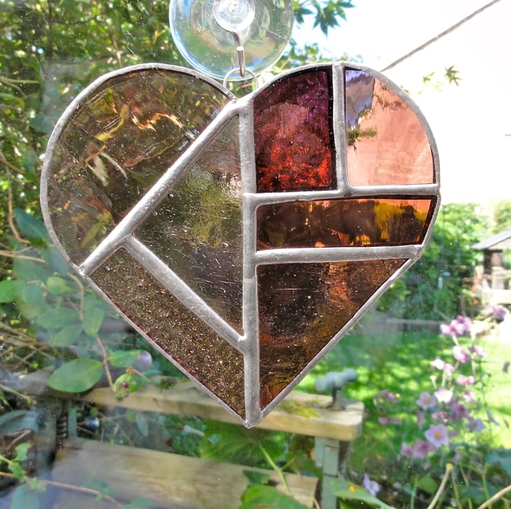 The glass used is a mixture of different pink glass and different textured glass. Each piece has been foiled and then soldered with a generous beading on the joints for added strength, I have left the solder silver. A ring has been attached for hanging purposes.