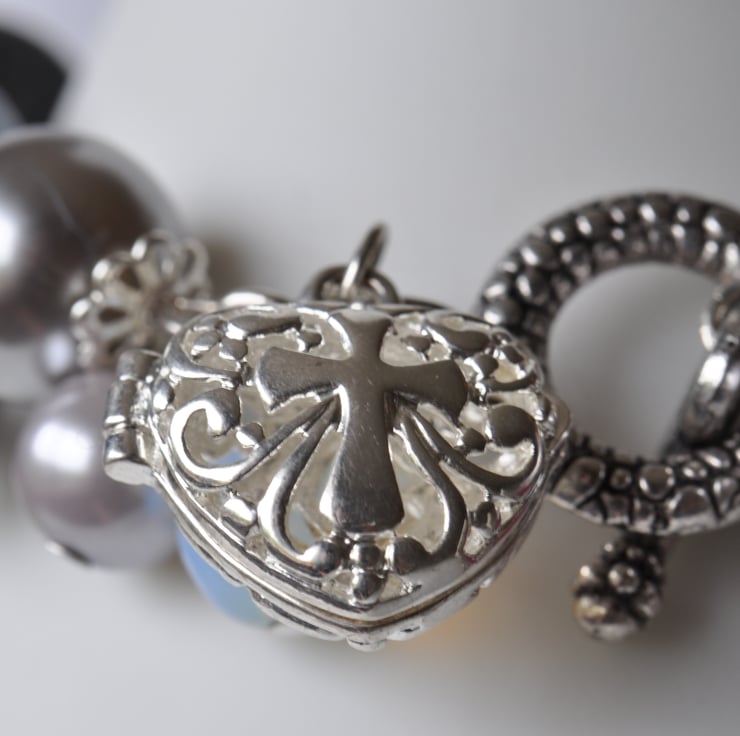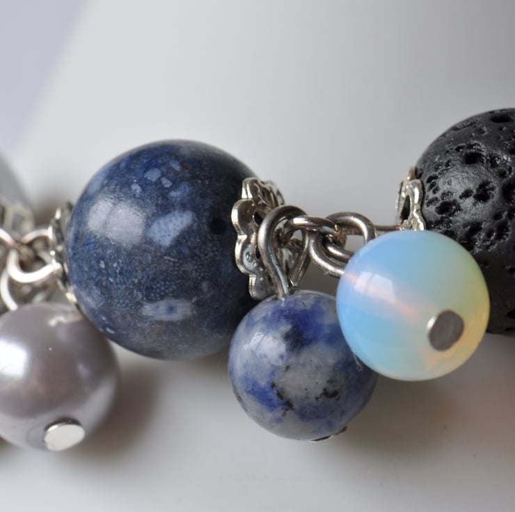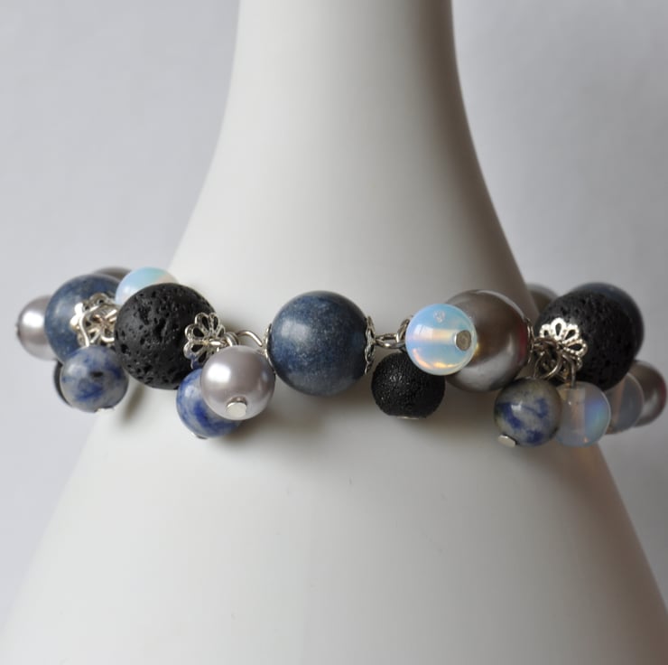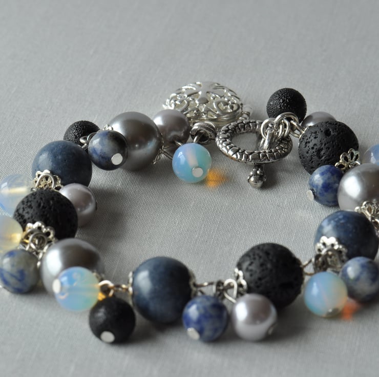 Beautiful handmade beaded bracelet featuring an array of gemstone beads including large 12mm lava rock beads, sponge blue coral beads and grey acrylic pearls with 8mm beads in gemstones of opalite and sodalite with grey glass pearls and acrylic black glitter effect beads finished with a stylish toggle clasp and heart prayer box locket.
