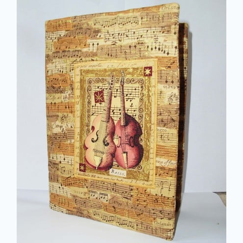 A5 fabric covered diary. The fabric shows a musical theme, with an applique musical panel on, which has been quilted to enhance the effect.