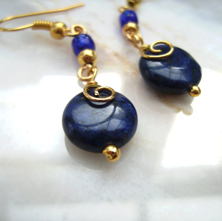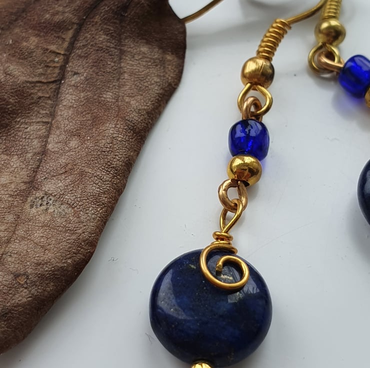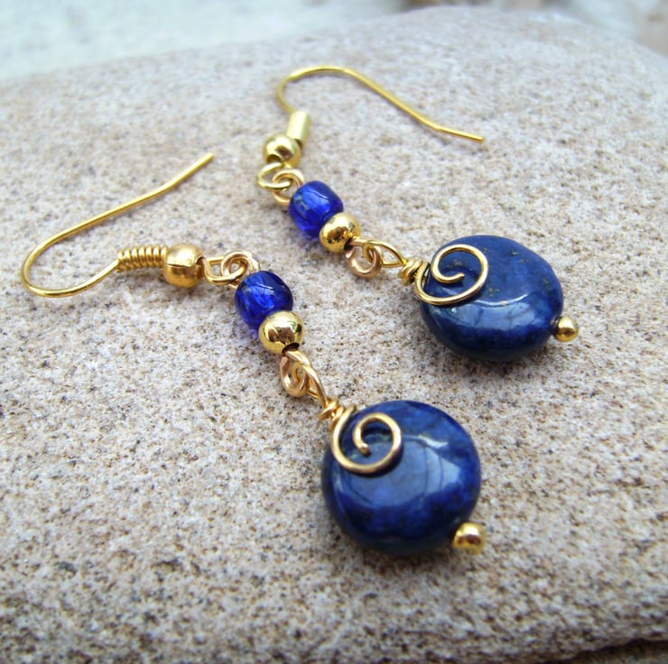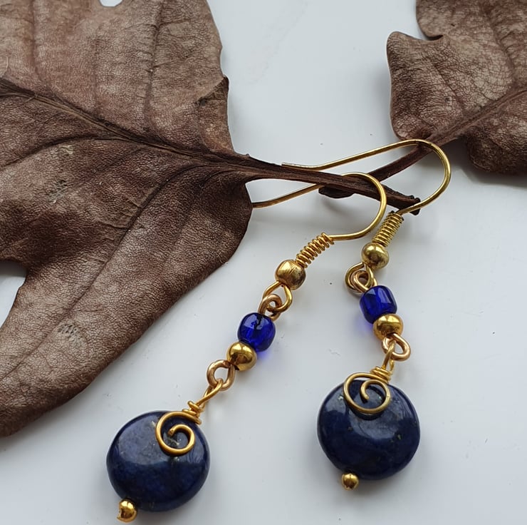 This pair of unique earrings have been created using 10mm lapis lazuli coin beads with gold plated spacer bead & dark blue Toho bead connected together with gold plated wire formed into spirals over the lapis lazuli beads. The drop from the top of the ear hook measures approximately 4.5 cm. If you would like a matching necklace, please ask.