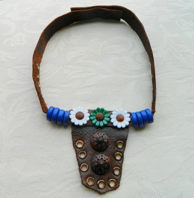 Using vintage hand stained leather salvaged from a 1960s leather coat, I have added eight blue wooden rondelle beads and three hand painted daisies, with two vintage metal military style domed buttons and carefully burnished metal eyelets.