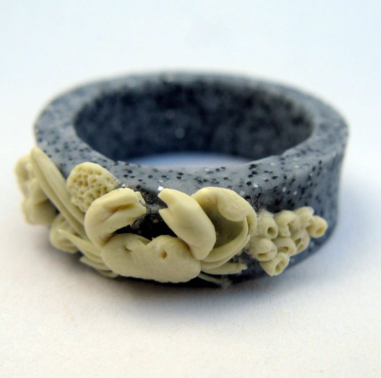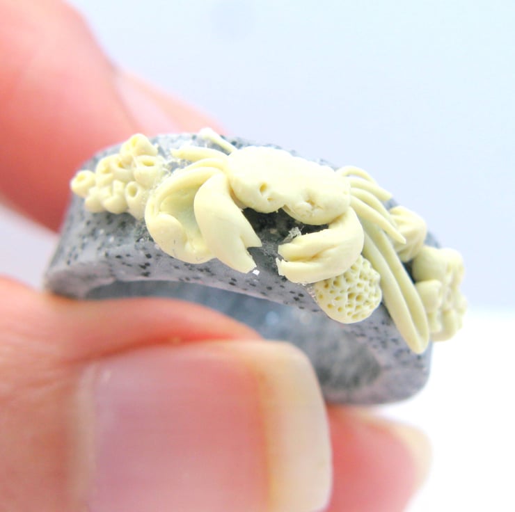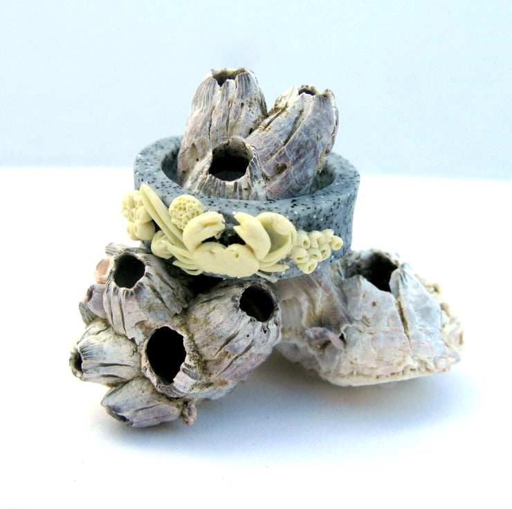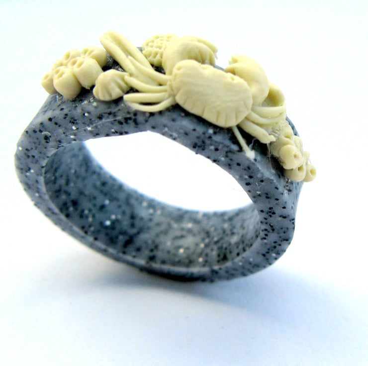 This rock pool ring was Inspired from an afternoon of beach combing, made entirely from polymer clay, it is decorated with shells, barnacles and a tiny crab on a granite effect ring.