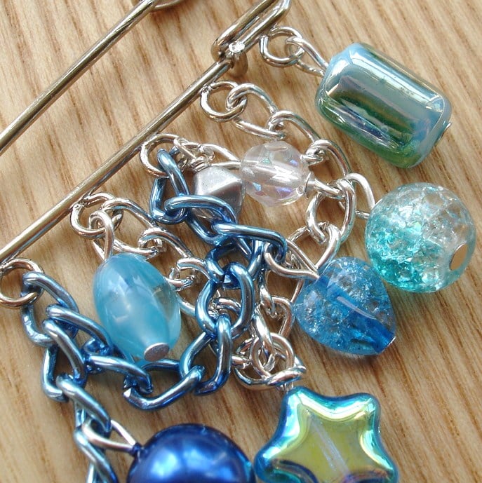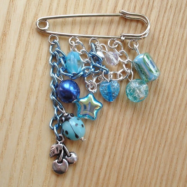 A riot of blue and turquoise, this kilt pin brooch has got it going on. With a blue lampwork glass ladybird bead, cherry charm and lots of glass beads, it's full to bursting. The chains give the piece a cascade effect that's really cute.